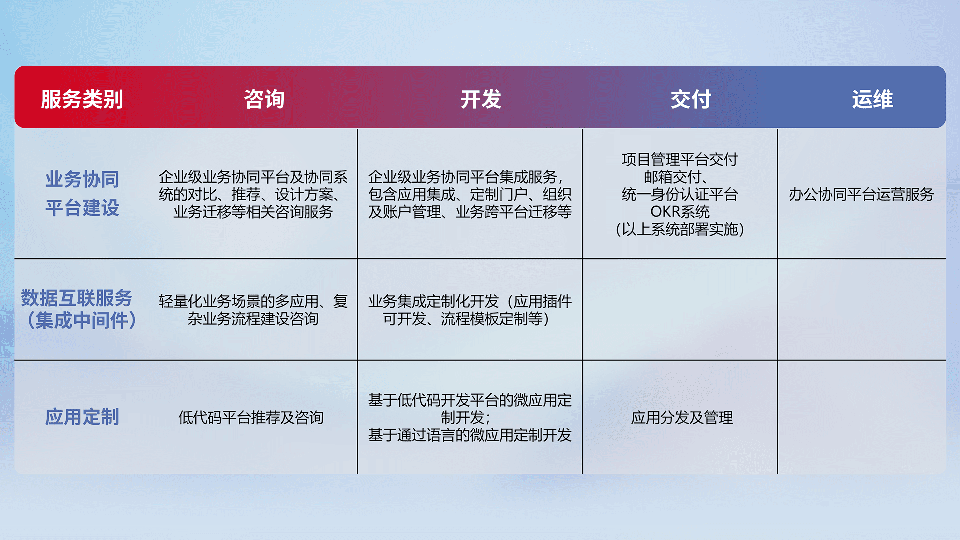 针对钉钉、、、、企微、、、IDaas等平台级产品提供产品的规划、、、、方案、、、、交付、、、、定制化开发等服务,,实现如统一协同办公、、、、智能客户服务、、、、混合会议管理、、、、智能数据查询、、、等业务场景,,,,实现数字化转型。。。。